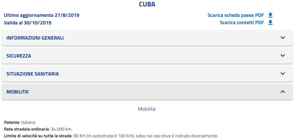 La pagina che si aprirà una volta che avrai scelto la Nazione che ti interessa, presenterà una cartina ed una serie di vari pulsanti dove per ultima troverai la voce MOBILITA’, cliccaci pure (ci troverai le informazioni per quanto riguarda Cuba, ci sei mai stato? Te la consiglio vivamente).